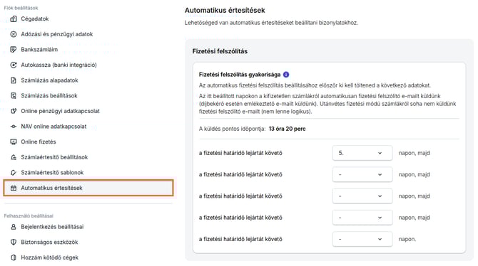 A fizetési felszólítás és díjbekérő emlékezető ütemezését a Beállítások / Fiók beállításai / Automatikus értesítések menüpontban tudod beállítani.