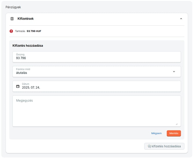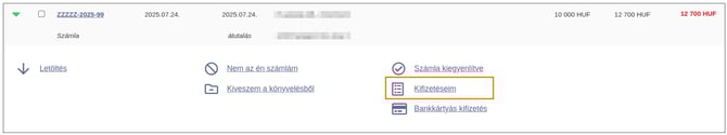 - Számlánkénti kifizetettség kezeléséhez kattints a számla sorszámára vagy a számlasor végén található három pötty alatt található Kifizetések lehetőségre, majd a megjelenő oldalon a Pénzügyek / Kifizetések pontban kezeld a jóváírást.