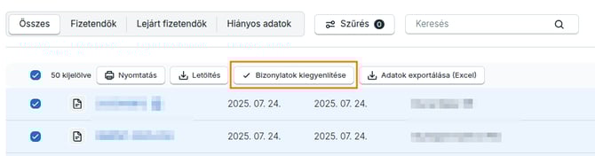 - Csoportos kifizetettség kezeléshez jelöld ki a számlákat, melyeket fizetettre szeretnél állítani, majd válaszd a számlák fejlécében megjelenő Bizonylatok kiegyenlítése lehetőséget.