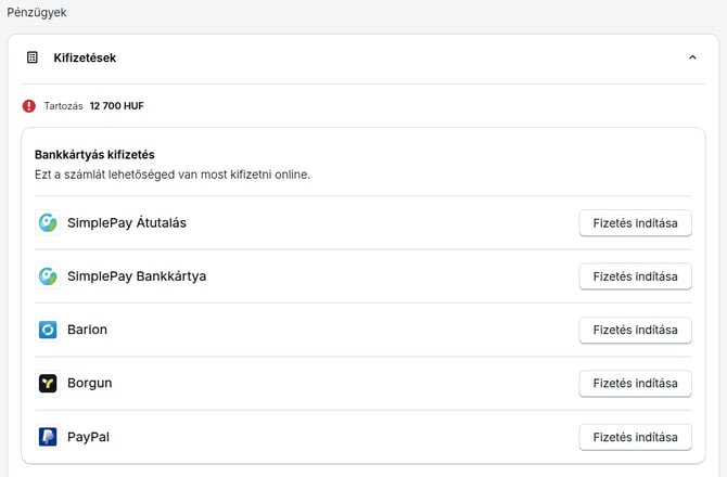 - Kifizetettség kezelése online fizetési megoldás segítségével is lehetséges, ha a számlát kiállító partner szintén Számlázz.hu-s és biztosít a rendszerben online fizetési lehetőséget. Ebben az esetben a Pénzügyek / Kifizetések menüpontban megjelennek az online fizetési lehetőségek is.