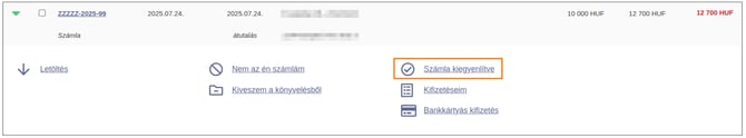 - Számlánkénti kifizetettség kezeléshez kattints a számlasorra, majd a megjelenő panelen válaszd a Számla kiegyenlítve lehetőséget, ahol csak a jóváírás dátumát kell megadnod.