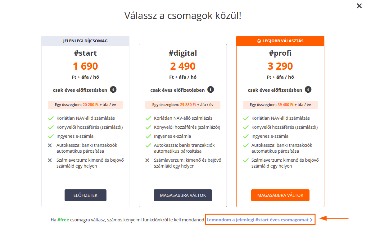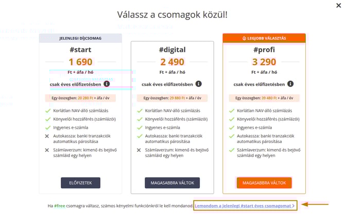 A jövőben használni kívánt csomag lemondás esetén a #free csomag, amellyel díjmentesen, korlátlan ideig tarthatod fenn fiókodat. Innen bármikor újra elő tudsz fizetni magasabb csomagra. Az ingyenes csomaggal továbbra is darabszámbeli korlátozás nélkül tudsz papír alapú számlát készíteni.