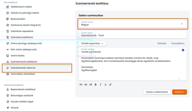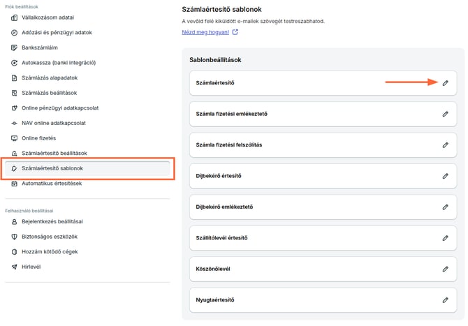 A Beállítások / Fiók beállításai / Számlaértesítő sablonok menüpontban összesen 7 értesítőtípusból választhatsz: számlaértesítő, számla fizetési emlékeztető, számla fizetési felszólítás, díjbekérő értesítő, díjbekérő emlékeztető, szállítólevél értesítő és köszönőlevél.