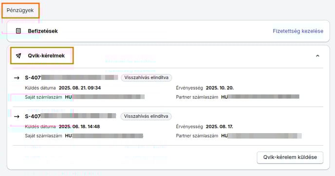- A számlasor végén a három pöttyre kattintva elérhető menüben a Qvik-kérelem lehetőséggel. A fenti képen látható, hogy az oldal alján megjelenik a korábbi kérelmek listája is.
