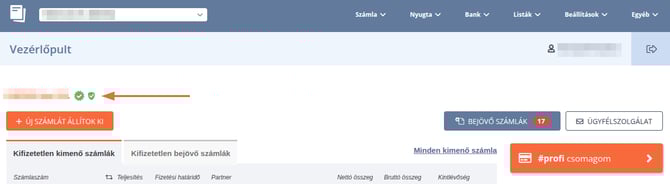 A vezérlőpulton a cégneved mellett a pajzs alakú ikon a NAV-megfelelőség jelölésére szolgál. Ha ez zöld
