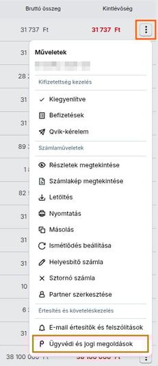Ha a számlád megfelel a fenti feltételeknek, a Számla / Kimenő számláim oldalon keresd meg az adott számlát. A számla sorának végén található három pöttyre kattintva nyisd meg a menüt, majd válaszd az „Ügyvédi és jogi megoldások” lehetőséget a követeléskezelési ügy indításához.