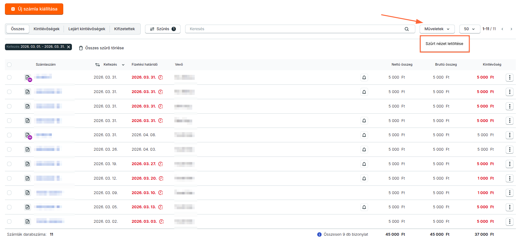 Amennyiben szűréssel válogattál le számlákat, a számlalista feletti Műveletek lenyíló menüben elérhető a Szűrt nézet letöltése is. Ezzel a nézettel a leválogatási feltételek által lekért listát tudod letölteni, ha több, mint 500 db, de kevesebb, mint 2 000 db számlát tartalmaz a szűrés.