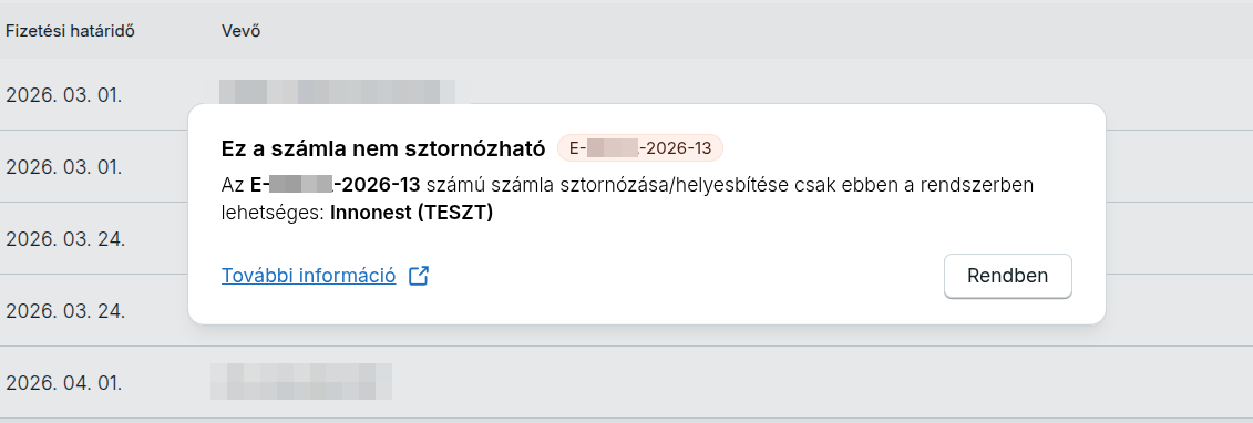 Ha emiatt helyesbítéskor vagy sztornózáskor hibaüzenetet kapsz (akár egyenkénti, akár csoportos művelet során), a számla módosítását az általad használt külső rendszerben kell elvégezni.