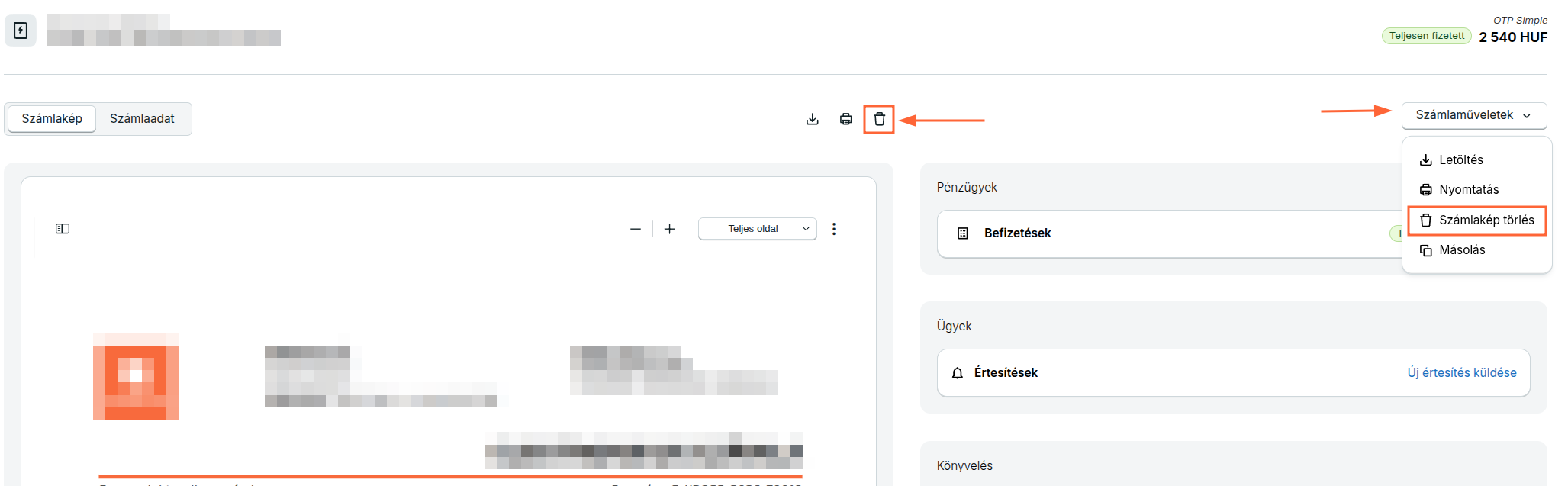 Ehhez a számlalistán (kimenő vagy bejövő) kattints a számla sorszámára. Válaszd a számlakép feletti kuka ikont vagy a Számlaműveletek / Számlakép törlés lehetőséget.