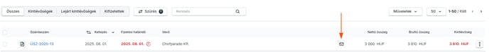 A postázás tényét jelezzük a kimenő számla sorában egy kis boríték ikonnal. Az ikonra húzva a kurzort látható a postára küldés időpontja, valamit egy újabb időpont, amennyiben a postázást végző partnerünk a postázási folyamatot megkezdte.