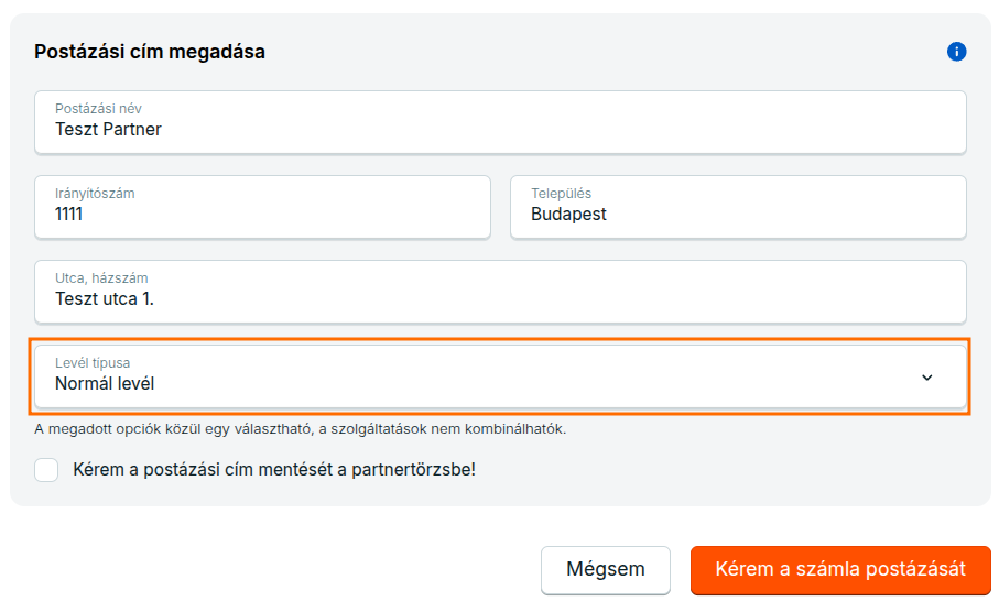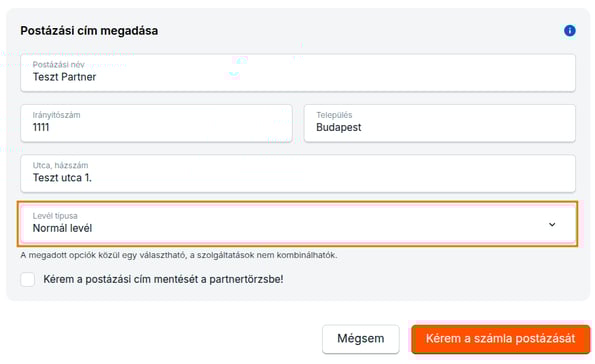 A megjelenő oldalon ellenőrizd le partnered adatait, Válaszd ki a levél típusát, majd kattints a Kérem a számla postázását gombra.