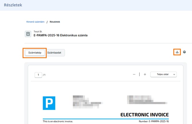 A letöltéshez kattints a számla sorszámára, így megnyílik a számla részletes nézete két hasábban. A bal oldalon látható a számlakép, ennek jobb felső sarkában találod a letöltés (nyíl ikon) és a nyomtatás gombot.