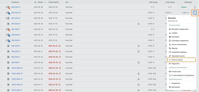 - A megjelenő menüben kattints a Sztornó számla lehetőségre.