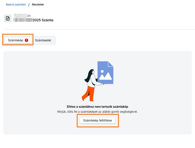 Kattints a számla sorszámára, majd a megjelenő oldalon balra kattints a Számlakép lehetőségre, végül a Számlakép feltöltése gombra, ahol feltöltheted a számítógépedről kiválasztott számlaképet.