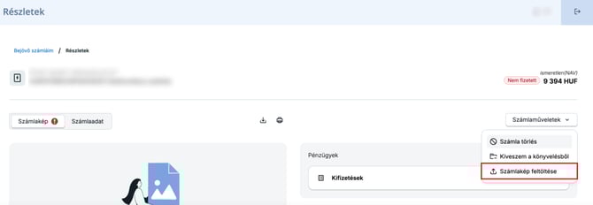 A "Tranzakciók" menüpont alján keresd ki, majd nyisd meg a megfelelő kategóriából a kívánt számlát. Amennyiben nem tartozik hozzá számlakép, akkor a megjelenő oldalon, a számla adataitól balra töltheted fel azt.