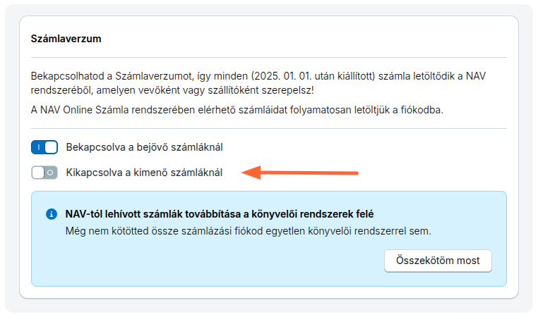 A kimenő számlák adatainak letöltését a Beállítások / Fiók beállításai / NAV Online adatkapcsolat menüpontban manuálisan kapcsolhatod be.