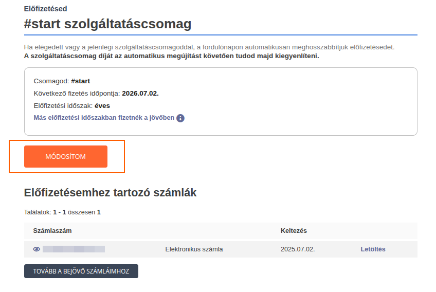 Ha szolgáltatáscsomagodat alacsonyabb tudásúra váltanád, akkor azt már most is beállíthatod szintén a Vezérlőpulton a szolgáltatáscsomag boxban, a Csomagom kezelése gombra kattintva, ami a Beállítások / Szolgáltatáscsomagom menüpontra irányít. Itt kattints a Módosítom gombra, és válaszd ki a megfelelő csomagot. Fontos tudni, hogy az új előfizetésed csak a jelenlegi előfizetési időszakod lejártát követően fog érvénybe lépni, azonban díját azonnal rendezni szükséges, ha bankkártyás fizetést választasz. Átutalásos fizetési mód esetén a díjat az igényléstől számított 7 napon belül szükséges kiegyenlíteni.